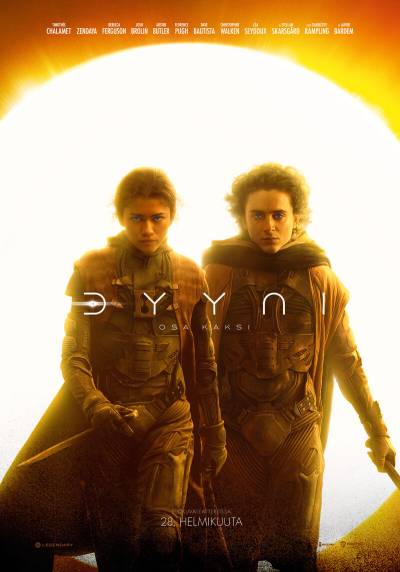 Suuren kankaan eeppinen tarina jatkaa sovitusta Frank Herbertin kehutusta bestselleristä, Dyynistä, palaavien ja uusien tähtien kera, mukaan lukien Oscar-ehdokas Timothée Chalamet (Wonka, Call Me by Your Name), Zendaya (Spider-Man: No Way Home, Malcolm & Marie, Euphoria), Rebecca Ferguson (Mission: Impossible – Dead Reckoning), Oscar-ehdokas Josh Brolin (Avengers: End Game, Milk), Oscar-ehdokas Austin Butler (Elvis, Once Upon A Time…In Hollywood), Oscar-ehdokas Florence Pugh (Black Widow, Pikku naisia), Dave Bautista (the Guardians of the Galaxy -elokuvat, Thor: Love and Thunder), Oscar-voittaja Christopher Walken (Kauriinmetsästäjät, Hairspray), Stephen McKinley Henderson (Fences, Lady Bird), Léa Seydoux (James Bond -franchise ja Crimes of the Future), sekä Stellan Skarsgård (Mamma Mia! -elokuvat, Avengers: Age of Ultron), sekä Oscar-ehdokas Charlotte Rampling (45 vuotta, Assassin’s Creed), ja Oscar-voittaja Javier Bardem (Menetetty maa, Being the Ricardos).